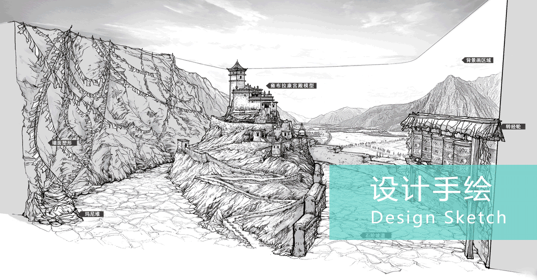 為了贏得文化共鳴,設(shè)計(jì)師將西藏歷史上第一座宮殿“雍布拉康”,整體引入空間。四面全景畫,局部投影高原藍(lán)天白云,結(jié)合影音,參觀者猶如已駐足青藏山巔,眺望遠(yuǎn)處, “第一座村莊”、“第一塊田地”盡收眼底。整體空間凝練,以磅礴氣勢(shì)迎領(lǐng)開篇。