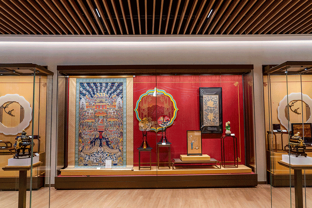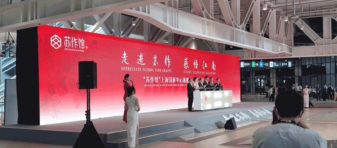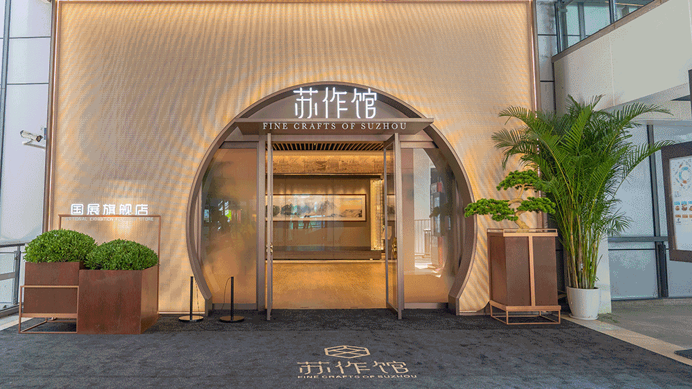 “蘇作館”坐落于上海國家會展中心,場館面積1200平米,歷時五個月精心打造。館內規(guī)劃設計有蘇宮區(qū)、大師精品區(qū)、大師衍生品區(qū)、蘇工蘇作演藝區(qū)、直播間等功能區(qū)
