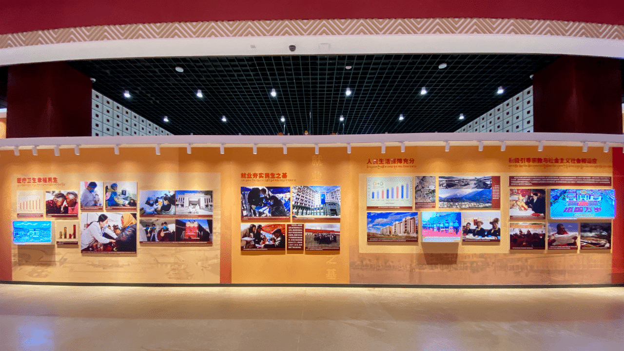 經過7個晝夜的緊張設計和施工,西藏和平解放70周年成就展順利開幕! 8月18日下午,全國政協主席汪洋率中央代表團全體成員來到西藏博物館,為《黨的光輝照邊疆 錦繡高原譜華章——西藏和平解放70周年成就展》開館揭幕、發表致辭,帶隊參觀了成就展并予以高度評價! 《黨的光輝照邊疆 錦繡高原譜華章——西藏和平解放70周年成就展》由“偉大歷程”和“輝煌成就”兩個部分組成。展覽全面回顧西藏和平解放、民主改革、自治區成立、社會主義建設、改革開放、進入新時代的歷史進程,全景展示在中國共產黨堅強領導下西藏經濟社會發展取得的偉大成就。 《十七條協議》簽字儀式歷史照片、實行民族區域自治制度的展板、對口援藏資金圖表、《西藏自治區民族團結進步模范區創建條例》圖片……一塊塊展板、一張張圖片圖表,生動展現了70年來西藏在黨的領導下取得的長足發展。 披星戴月,晝夜奮斗,金螳螂文化的設計施工團隊見過太陽初升時的拉薩,也見證著西藏和平解放70周年成就的輝煌。金螳螂文化以匠心出品致敬西藏和平解放70周年,以經年累月的專業和敬業,努力做文化與藝術的傳播者。 目前,西藏博物館基本陳列——西藏歷史與文化展也正處于緊鑼密鼓的施工階段。金螳螂文化集結精銳力量,聚力呈現全新的西藏博物館,弘揚藏地文化之美。