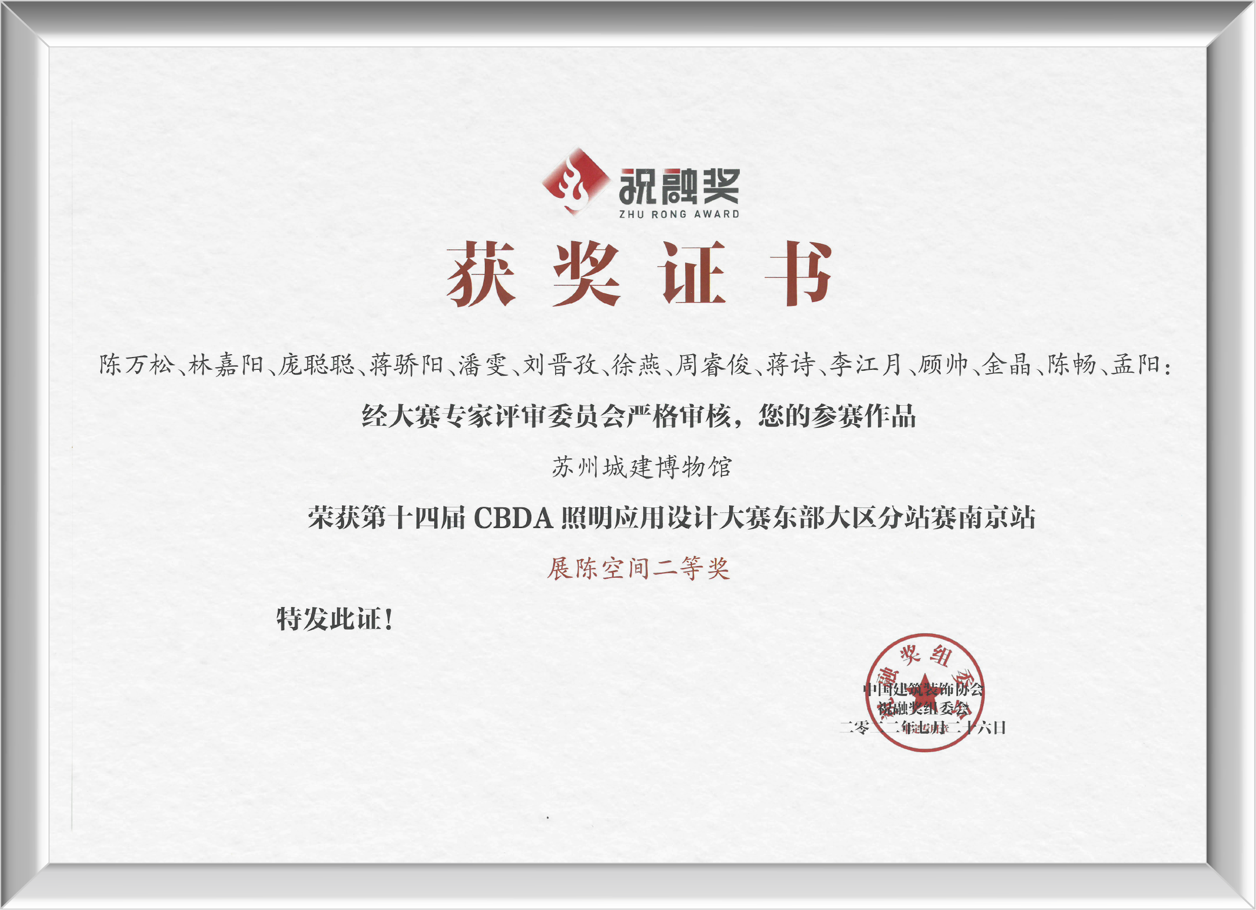 當晚的頒獎典禮上,組委會正式公布了2022年度祝融獎東部大區(qū)分站賽(南京)各空間獎項、佳作獎、優(yōu)勝獎等榮譽。金螳螂文化憑借作品蘇州城建博物館榮獲展陳空間二等獎。
